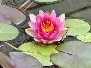 1stGardenのビオトープの池で今年初めてスイレンの花が咲きました。 春先に沈めていた網の鉢ごとスイレンの多くを池から取り除いていたので、残っていた根が成長して花が咲いたのです。