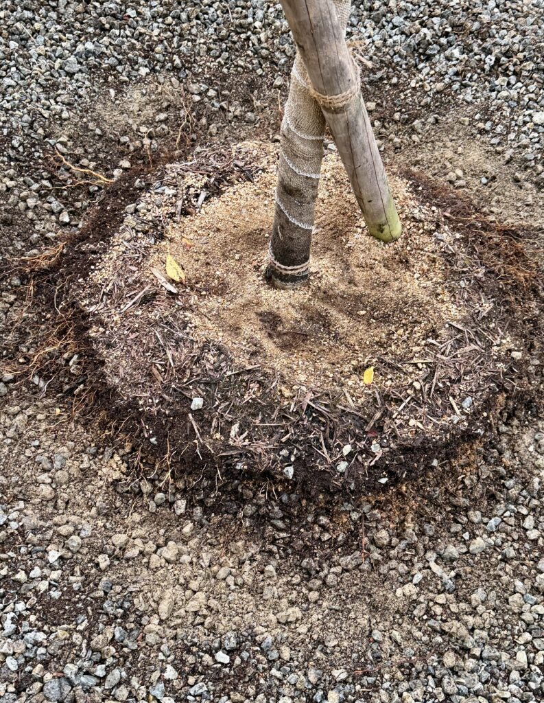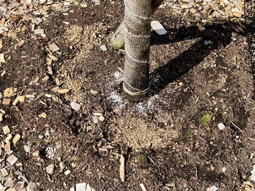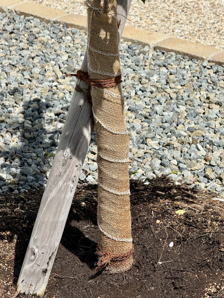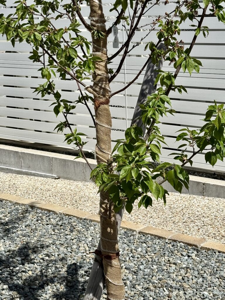 新芽が傷んでおり、周囲が石で日光の照り返しが良くないということで、直射日光が当たらないように幹巻きテープ作業をしていただきました。