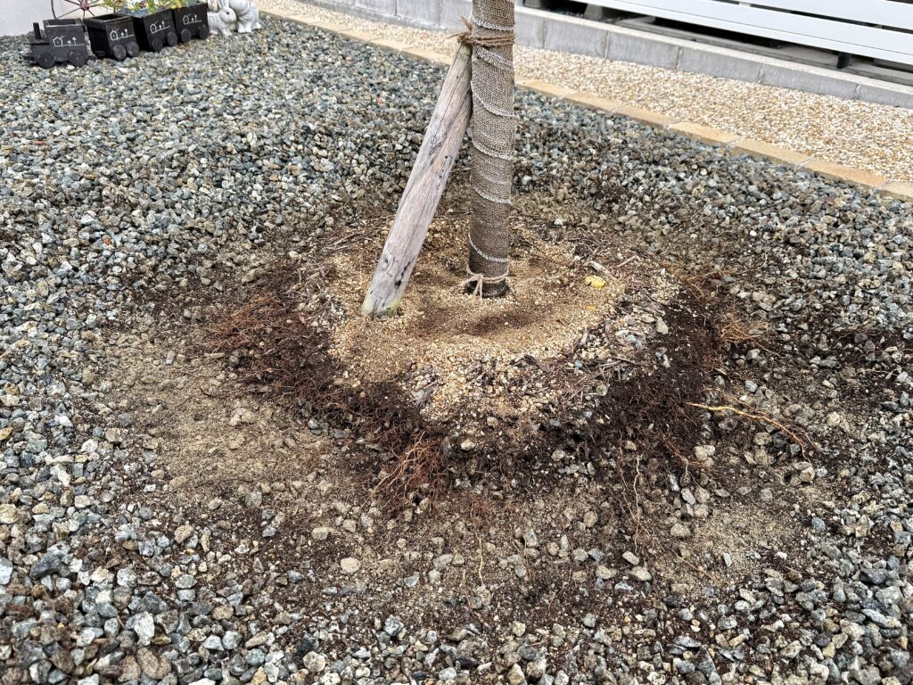 猛暑の夏に熱くなった砂利を取り除いてみるとその中に桜の根が伸びていました。