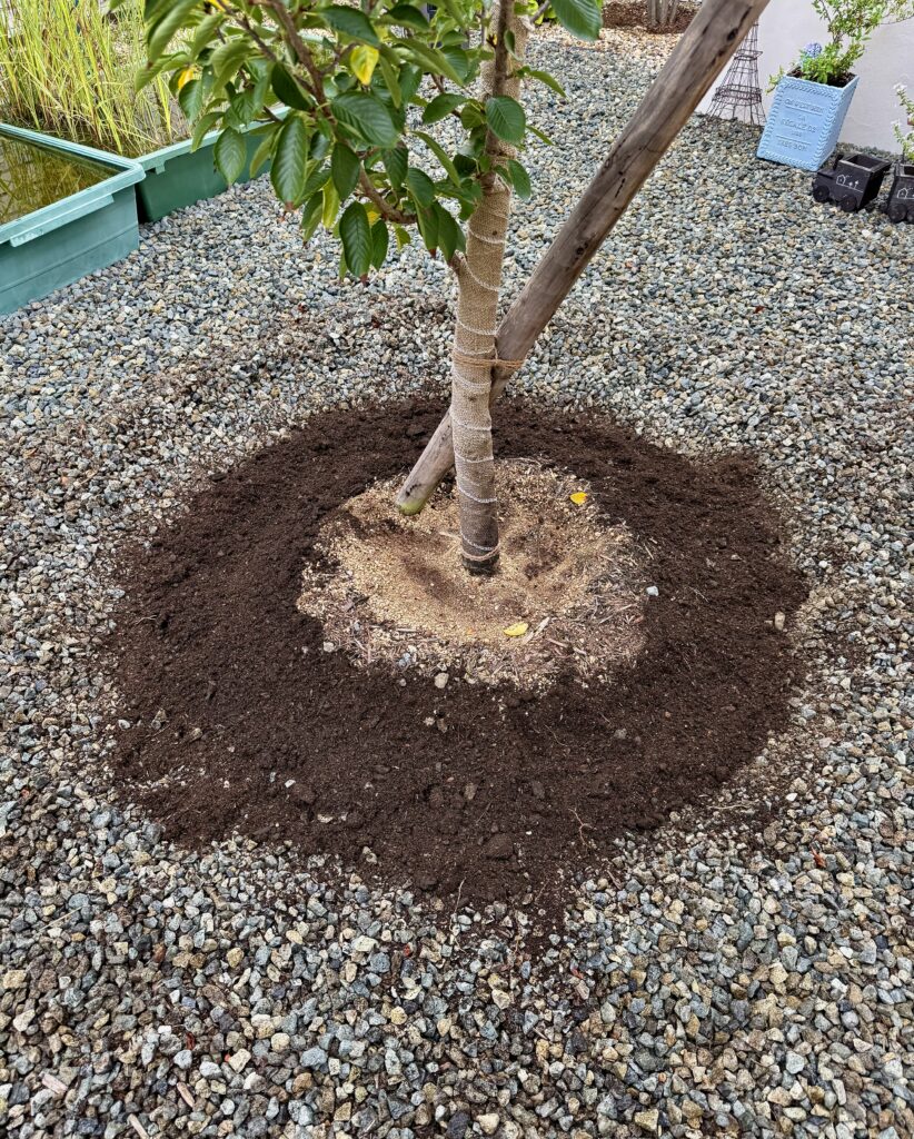 これでは桜が弱ると思い、除草シートの上まで掘って「畑の土」というのを入れました。