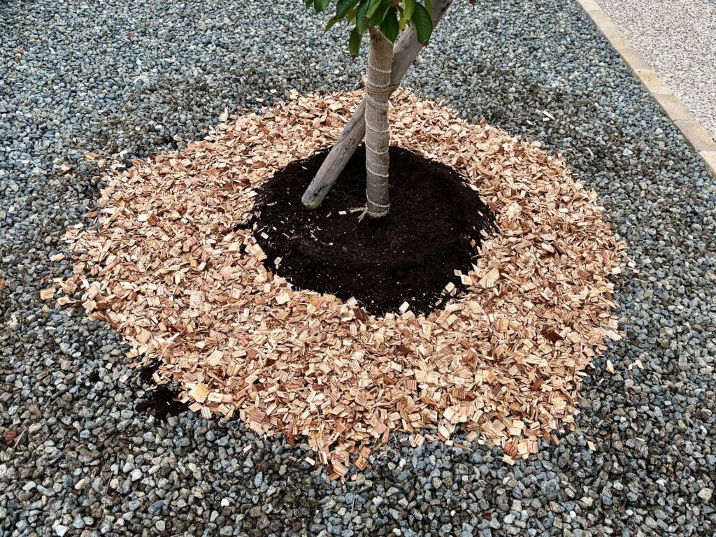 その上に「バーク堆肥」を入れ、一番上に「ウッドチップ」を敷きました。
