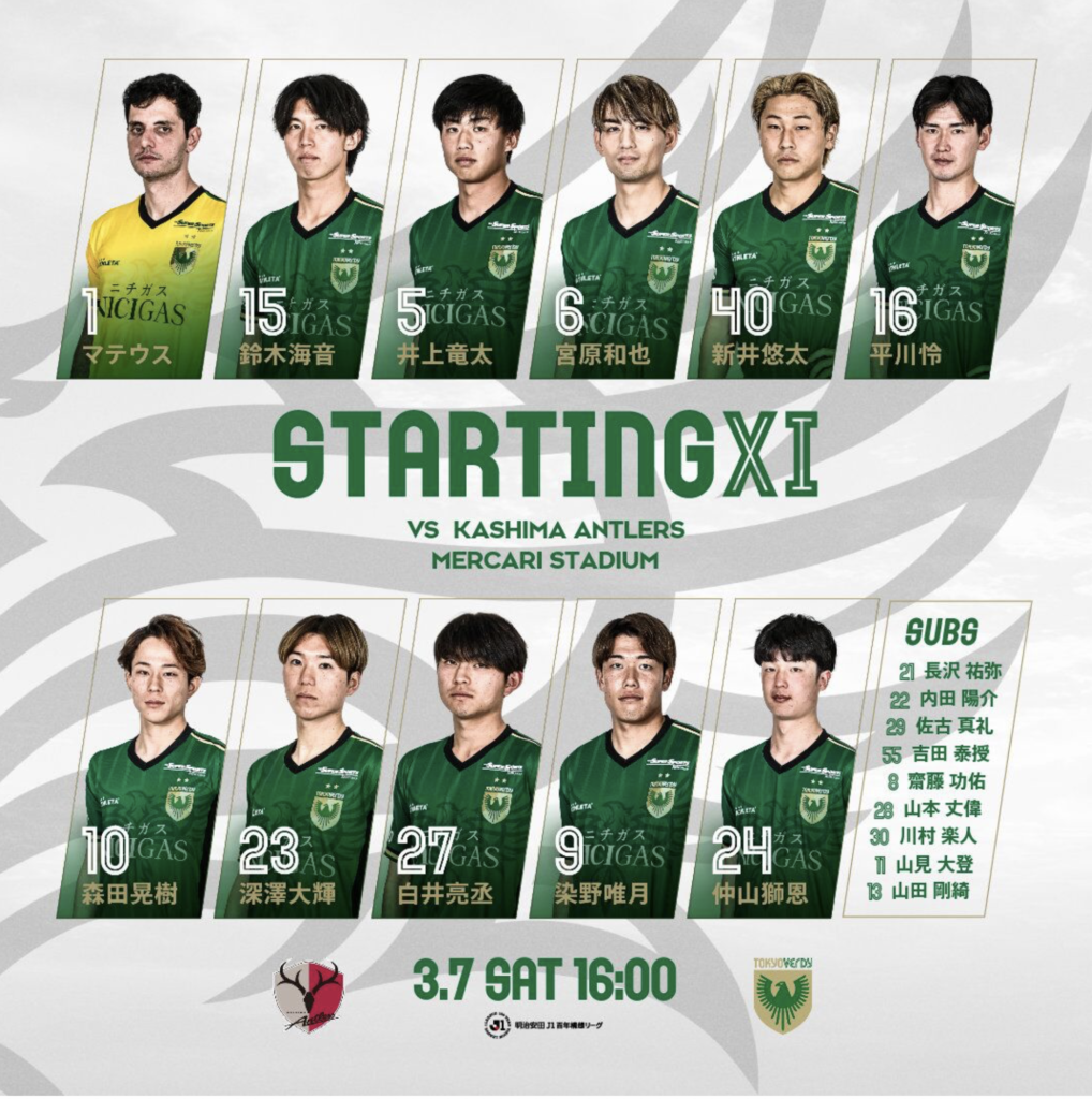 | 鹿島アントラーズ: (スタメン)早川友基;キムテヒョン、溝口修平、濃野公人、植田直通、三竿健斗、柴崎岳、荒木遼太郎、チャヴリッチ、レオ・セアラ、鈴木優磨 東京ヴェルディ: (スタメン)マテウス;井上竜太、宮原和也、鈴木海音、森田晃樹、平川怜、深澤大輝、新井悠太、染野唯月、仲山獅恩、白井亮丞 | ||
