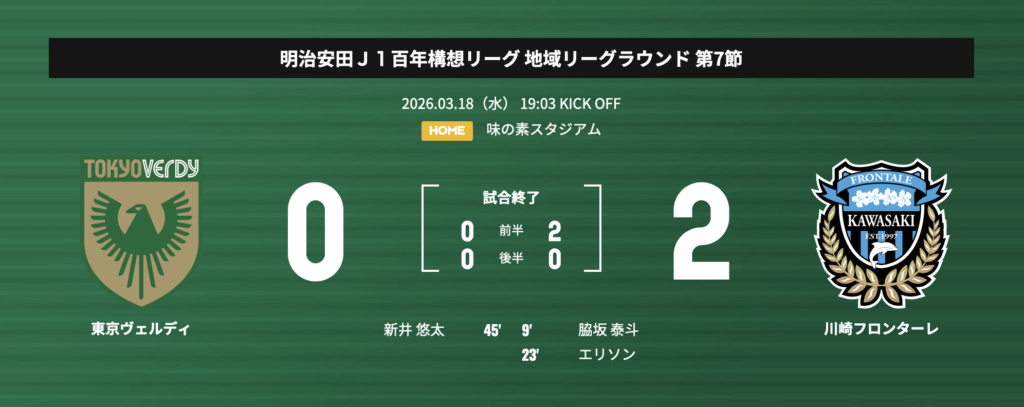 | 東京ヴェルディ | 0 - 2 | 川崎フロンターレ |